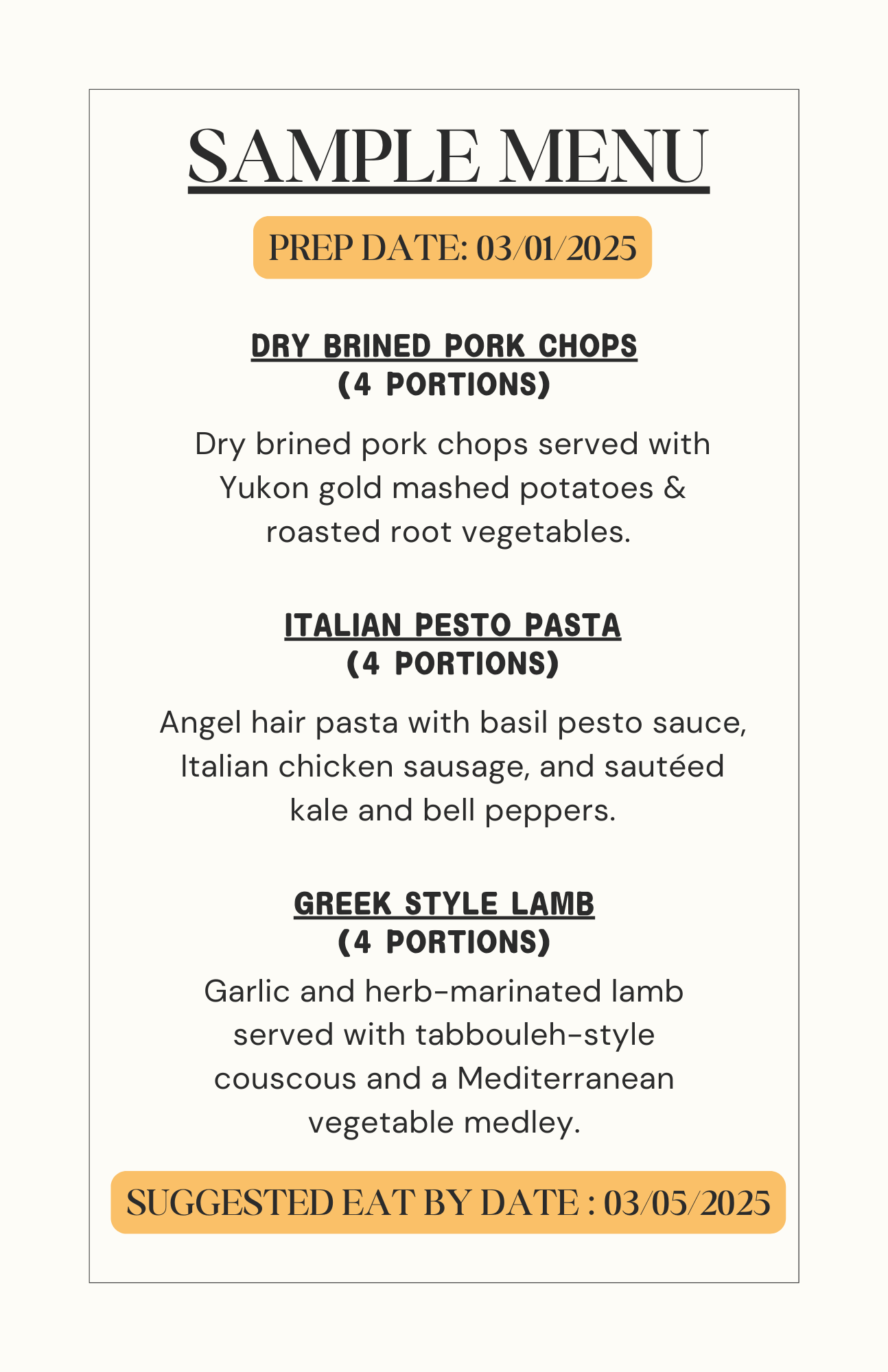 I will prep and package meals in your home, in your preferred containers. I can guide you on containers to purchase if needed.